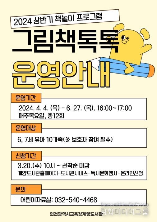 시민행정신문 김지은 기자 | 인천광역시교육청계양도서관은 6, 7세 유아 가족을 대상으로 다양한 책놀이 활동과 글쓰기 수업을 진행하는 '그림책톡톡' 프로그램을 4월 4일부터 6월 27일까지 매주 목요일 오후 4시 운영한다.