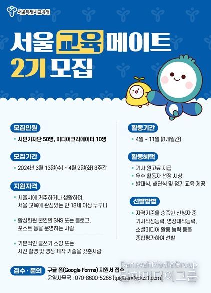 시민행정신문 김지은 기자 | 서울특별시교육청은 3월 13일부터 4월 2일까지 서울교육메이트(온라인 서포터즈) 2기를 모집한다.