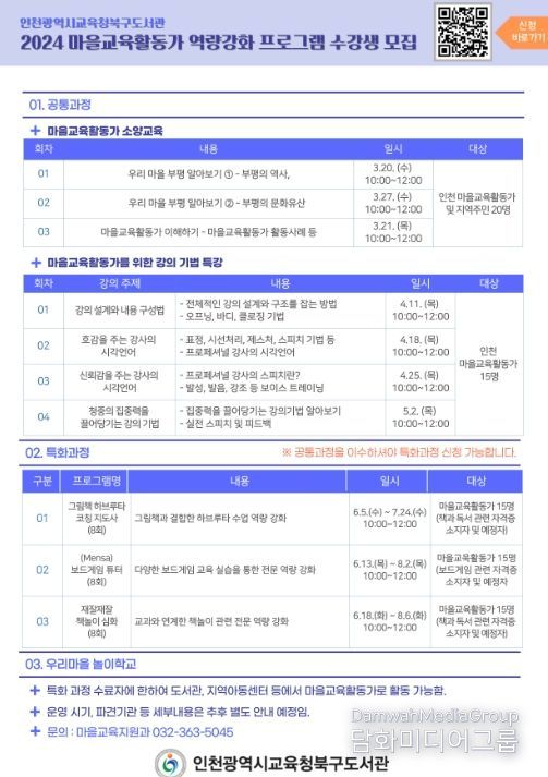 시민행정신문 김지은 기자 | 인천광역시교육청북구도서관은 '2024 마을교육활동가 역량강화' 프로그램 수강생을 13일부터 모집한다.