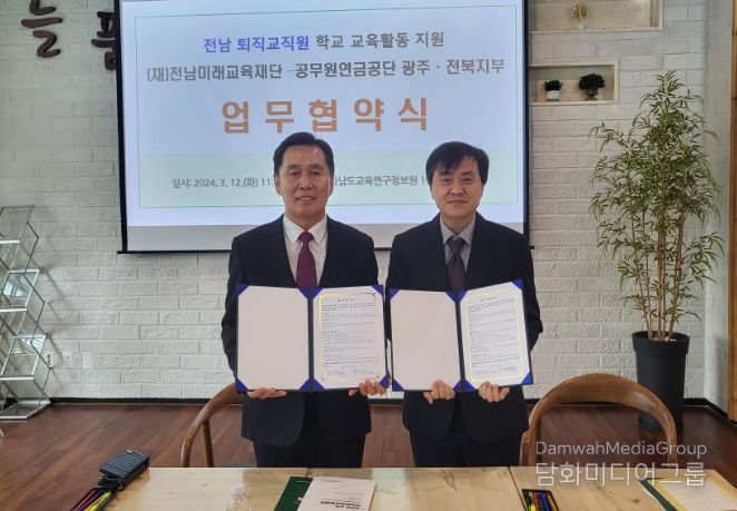 시민행정신문 김지은 기자 | 전남미래교육재단과 공무원연금공단 광주·전북 지부가 12일 전남교육청교육연구정보원에서 업무협약을 맺고, 퇴직 교직원들의 학교교육지원 활성화에 나섰다.
