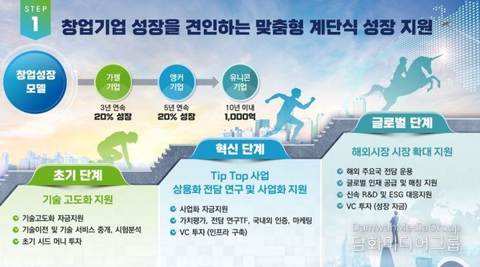 창업기업을 초기, 혁신, 글로벌 단계로 구분하고 성장 단계별 계단식 지원프로그램을 운영한다.