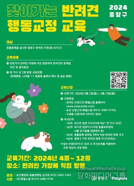 교육 신청은 ㈜펫펄스랩 누리집(홈페이지)에서 온라인으로 신청하거나 유선으로 신청하면 된다. 찾아가는 반려견 행동교정 교육 포스터에 있는 QR코드에 접속해 구글폼으로 신청할 수 있다.