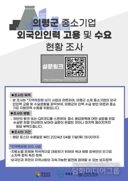 수요조사는 외국인 근로자를 고용하고 있는 의령군 소재 기업체 또는 우수인재 외국인 채용을 희망하는 기업체 대상으로 진행되며, 참여기업체를 대상으로 1만원 상당의 의령 살리기 홍보 물품을 증정할 예정이다.