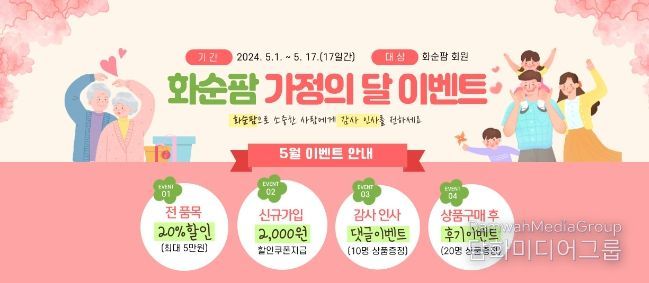 시민행정신문 강갑수 기자 | 화순군은 5월 가정의 달을 맞이하여 화순팜에서 20% 할인 이벤트를 5월 1일부터 5월 17일까지 실시한다. 이벤트는 할인이벤트, 감사 댓글 남기기 이벤트, 구매 후기 이벤트로 구성한다.