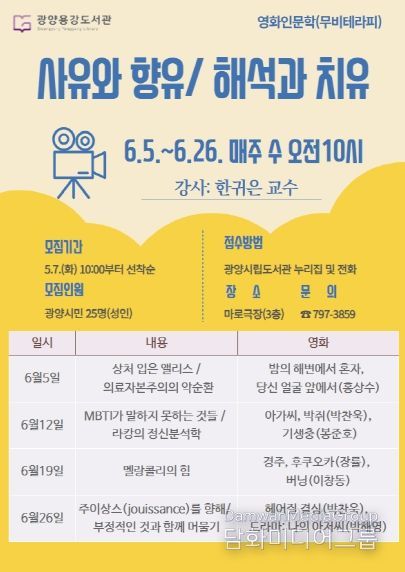 '인문강연(무비테라피)'은 오는 6월 5일부터 26일까지 매주 수요일 오전 10시 총 4회에 걸쳐 진행되며, ‘갈등과 상처, 증상’이 사유와 해석의 과정에서 ‘치유와 향유’가 될 수 있음을 영화를 통해 성찰하는 시간을 가질 예정이다.