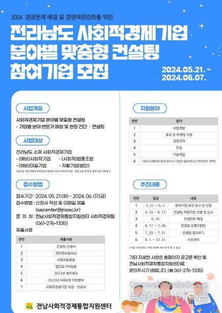 시민행정신문 강갑수 기자 | 전남사회적경제통합지원센터는 사회적경제기업의 경쟁력 제고를 위해 ‘2024년 전라남도 사회적경제기업 분야별 맞춤형 컨설팅’참여 기업을 모집한다고 밝혔다.