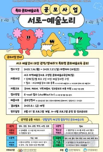 '서로-예술노리' 공모는 오는 7월 14일부터 7월 27일까지 접수 받으며, 인천 서구를 기반으로 활동 중인 예술강사들의 많은 참여를 기대하고 있다.