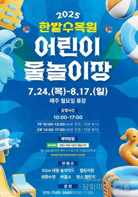 이번 물놀이장은 엑스포시민광장에 대형 워터슬라이드, 풀장 등 다양한 물놀이 기구가 설치되며, 어린이와 보호자 모두가 즐길 수 있는 레크리에이션, 생존수영 교육 등 프로그램도 함께 마련된다.