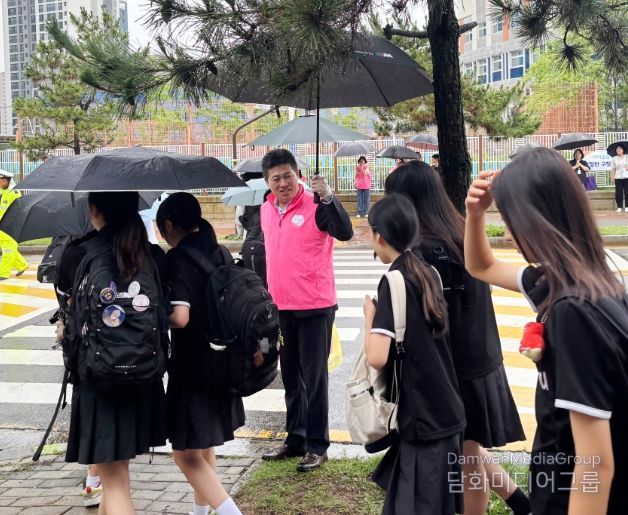 이날 김정헌 구청장은 장마철 궂은 날씨에도 학교장, 교직원, 학부모 등과 함께 학교 앞 교통환경과 현장을 면밀하게 점검하고 어린이들의 등굣길 안전을 살피는 데 주력했다.