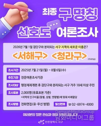 한편 구는 여론조사 홍보와 명칭변경 공감대 확산을 위해 7월 28일부터 30일까지 행정체제개편 후 서구 지역 전 세대를 대상으로 안내문을 발송할 계획이다.