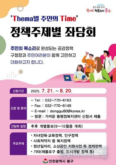 시민행정신문 강갑수 기자 | 인천 동구는 구민과의 소통을 강화하고 주민 참여 중심의 구정을 실현하기 위해, 정책 주제별 좌담회 ‘Thema별 주민의 Time’을 오는 9월부터 개최한다고 밝혔다.