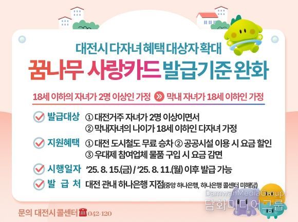 김종민 대전시 복지국장은 “이번 발급 기준 완화로 더 많은 다자녀 가정이 카드 혜택을 누릴 수 있게 됐다”라며, “앞으로도 아이 키우기 좋은 도시 대전이 될 수 있도록 지속적으로 노력하겠다”라고 말했다.
