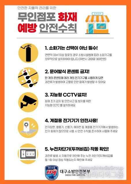 시민행정신문 강갑수 기자 | 대구소방안전본부는 최근 무인점포 증가에 따른 화재 위험에 선제적으로 대응하기 위해 무인점포 맞춤형 화재예방대책을 추진한다.
