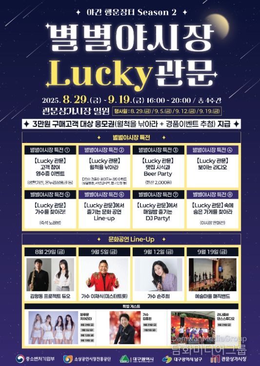 시민행정신문 강갑수 기자 | 대구 남구는 관문상가시장(상인회장 박삼수)에서 오는 8월 29일부터 관문상가시장 ‘별별야시장 Lucky관문 야간 행운장터 시즌2’를 개최한다고 밝혔다.