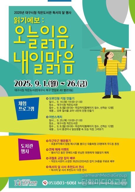 시민행정신문 강갑수 기자 | 대구광역시청 작은도서관은 9월 ‘독서의 달’을 맞아, 9월 1일부터 26일까지 4주간 ‘읽기예보: 오늘읽음, 내일맑음’이라는 주제로 시민을 위한 다양한 독서문화 행사를 운영한다.