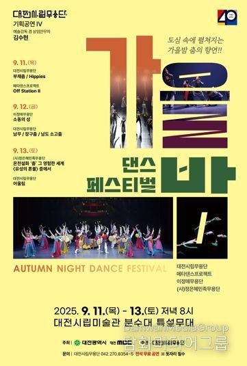 시민행정신문 기자 | 대전시립무용단은 오는 9월 11일부터 13일까지 사흘간 오후 8시, 대전시립미술관 분수대 특설무대에서 제24회 기획공연 ‘가을밤 댄스 페스티벌’을 개최한다. 올해 공연은 시립무용단 창단 40주년을 기념해 지역의 대표 무용단들과 함께 꾸며지며, 시민 누구나 무료로 관람할 수 있다.