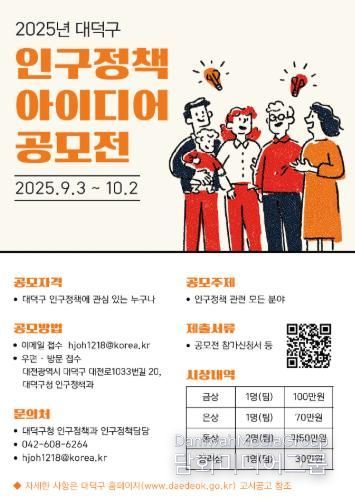 구는 인구정책에 대한 주민 참여를 확대하고, 실효성 있는 정책을 발굴하기 위해 ‘2025년 대덕구 인구정책 아이디어 공모전’을 진행한다고 1일 밝혔다.