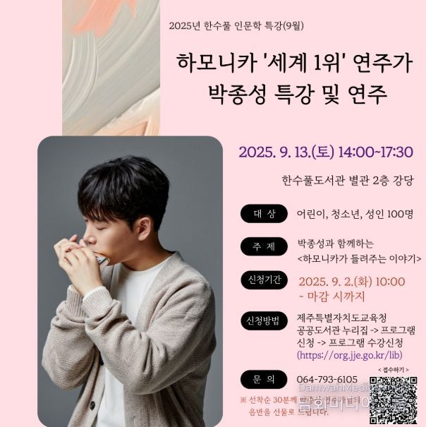 시민행정신문 기자 | 제주도교육청 한수풀도서관은 오는 13일 오후 2시부터 5시 30분까지 별관 강당에서 인문학 특강 ‘하모니카가 들려주는 이야기’를 개최한다.