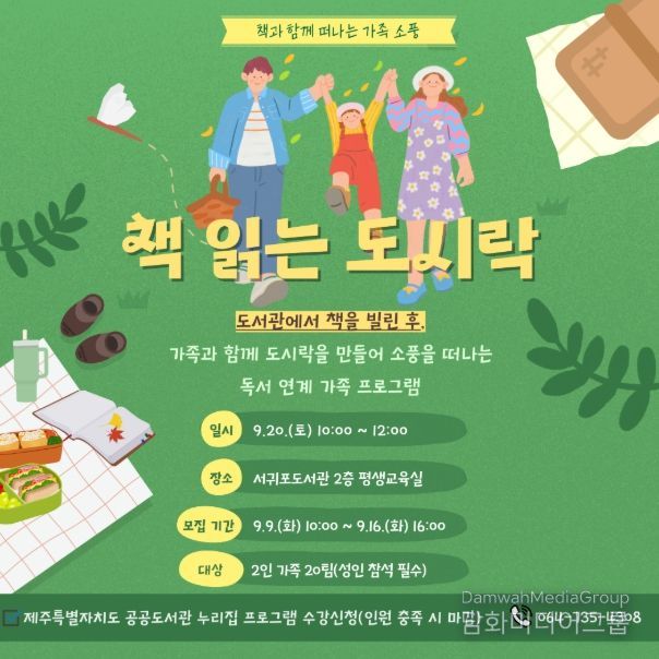 또한 책을 대출한 후 비전나래 김혜연 대표와 함께 도시락을 만들어보는‘책 읽는 도시락’프로그램은 2인 가족 20팀(40명)을 대상으로 오는 20일 오전 10시부터 12시까지 서귀포도서관 평생교육실에서 진행되며 신청은 오는 9일 오전 10시부터 16일 오후 4시까지 도교육청 공공도서관 누리집으로 하면 된다.