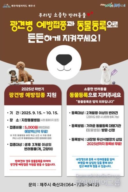 시민행정신문 강갑수 기자 | 제주시는 광견병 예방과 시민 안전을 위해 오는 9월 15일부터 10월 15일까지 3개월령 이상 반려동물(개, 고양이)을 대상으로 하반기 광견병 예방접종을 지원한다.