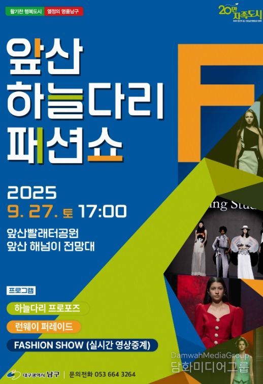 시민행정신문 강갑수 기자 | 대구 남구는 오는 9월 27일 지역의 대표 관광명소인 앞산빨래터공원에서 하늘다리 패션쇼와 프러포즈 이벤트를 개최한다고 밝혔다.