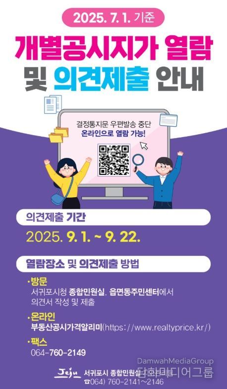 시민행정신문 강갑수 기자 | 서귀포시는 2025년 7월 1일 기준 개별공시지가 산정을 완료하고, 9월 1일부터 9월 22일까지 개별공시지가 열람 및 의견 제출 기간을 운영한다고 밝혔다.