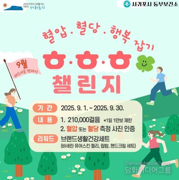 시민행정신문 기자 | 서귀포시 동부보건소는 2025년 심뇌혈관질환 예방관리 주간을 맞이하여 '자기혈관 숫자알기, 레드서클 캠페인'의 일환으로 9월 한 달간 모바일 앱 ‘워크온’을 활용한 ‘ㅎˑㅎˑㅎ(혈압ˑ혈당ˑ행복) 잡기 걷기 챌린지’를 운영한다.