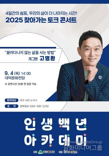 특히, 고명환은 ‘2025 대구 올해의 책’에 선정된 저서 ‘고전이 답했다 마땅히 살아야 할 삶에 대하여’의 저자로, 고전 속 지혜와 본인의 경험을 바탕으로 시민들에게 깊이 있는 인생의 통찰을 전할 예정이다.