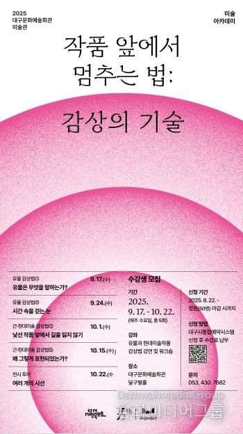 시민행정신문 강갑수 기자 | 대구문화예술회관은 오는 9월 17일부터 10월 22일까지 매주 수요일 오후 2시, ‘2025 대구문화예술회관 미술 아카데미’를 운영한다.