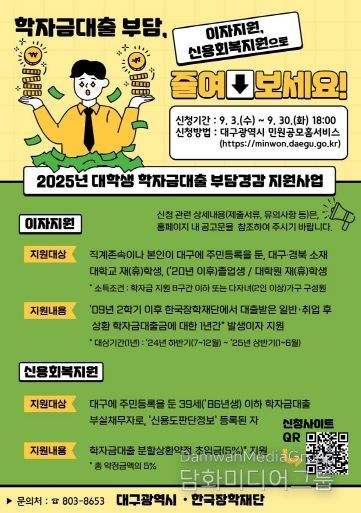 시민행정신문 기자 | 대구광역시는 지역 청년들이 경제적 부담을 덜고 학업과 취업에 전념할 수 있도록 ‘2025년 대학생 학자금대출 부담경감 지원사업’을 추진한다.