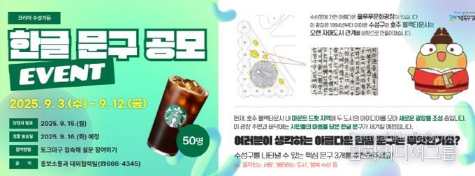 공모 기간은 9월 3일부터 9월 12일까지이며, 수성구청 홈페이지(누리집) 내 ‘토크대구’ 설문조사 알림창을 통해 누구나 참여할 수 있다. 참여자들은 수성구를 대표할 수 있는 한글 문구 3개를 자유롭게 추천할 수 있으며, 추첨을 통해 50명에게 커피 모바일 교환권을 증정한다.