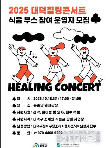 시민행정신문 기자 | 대덕문화관광재단(이사장 최충규)은 오는 10월 18일 동춘당 원형광장에서 열리는 ‘2025 대덕힐링콘서트’ 현장 운영을 맡을 식음(푸드·음료) 부스 운영자를 공개 모집한다고 밝혔다.