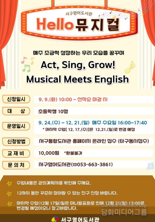 시민행정신문 강갑수 기자 | 대구 서구 영어도서관은 초등학생을 위한 특별 강좌 'Hello 뮤지컬'을 9월 24일부터 12월 21일까지 운영한다고 밝혔다.