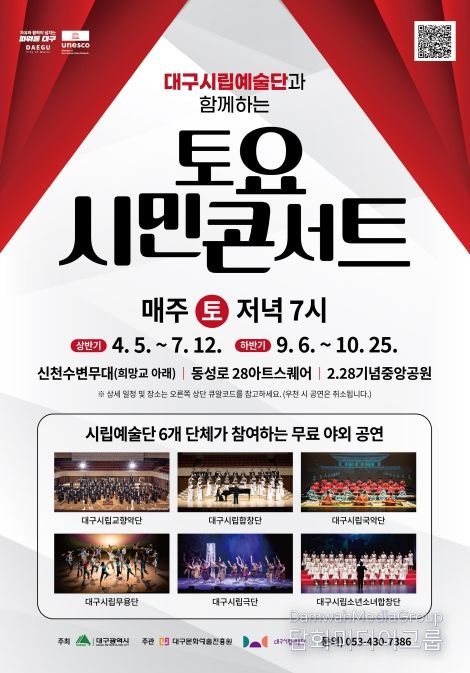 시민행정신문 강갑수 기자 | 대구광역시는 시민들의 일상 속 문화예술 접근성을 높이고 신천 및 동성로 등 지역 핵심공간에 활력을 불어넣기 위해, 오는 9월 6일부터 시립예술단 ‘토요시민콘서트’ 하반기 공연을 시작한다.