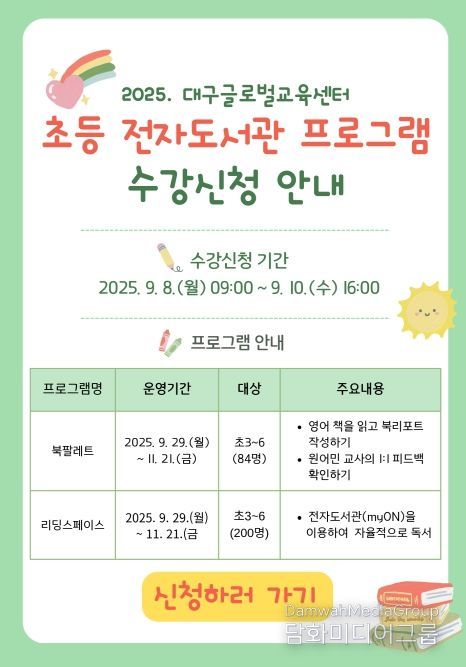 시민행정신문 기자 | 대구교육연수원 산하 대구글로벌교육센터는 9월 29일부터 11월 21일까지 초등학교 3~6학년 학생 284명을 대상으로 영어 문해력 향상과 자기주도적인 독서 습관 형성을 위해 전자도서관을 활용한‘초등 온라인 영어 독서 프로그램’을 운영한다.