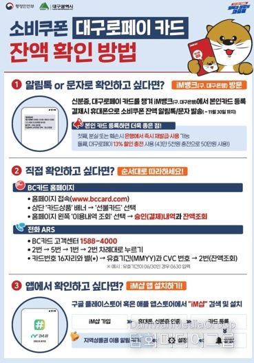 행정복지센터에서 발급받은 대구로페이 카드의 경우, 소비쿠폰 잔액 알림 서비스를 제공받기 위해서는 반드시 신분증과 카드를 지참해 iM뱅크 영업점에서 본인카드 등록(기명화) 절차를 마쳐야 한다.