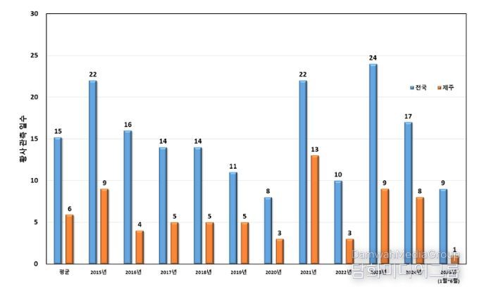 시민행정신문 김학영 기자 | 제주특별자치도 보건환경연구원은 올해 상반기 제주지역 황사 관측일수가 1일에 그쳐 지난해 같은 기간 8일 대비 크게 감소했다고 밝혔다.