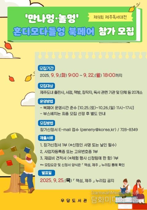 시민행정신문 기자 | 제주시 우당도서관에서는 오는 10월 개최되는 제9회 제주독서대전을 맞아 ‘만나멍·놀멍 혼디 모다들엉 북페어’ 참가팀을 모집한다.
