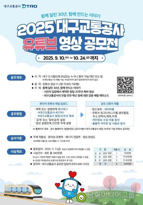 시민행정신문 강갑수 기자 | 대구교통공사는 창립 30주년을 기념해 ‘대구교통공사 유튜브 영상 공모전’을 개최한다.