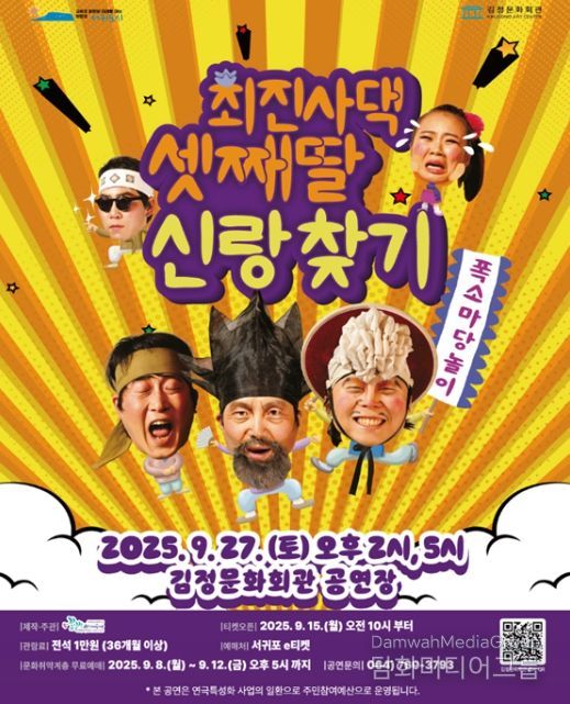 시민행정신문 기자 | 서귀포시는 전통과 현대를 넘나드는 해학과 풍자의 퓨전 마당극 '최진사댁 셋째딸 신랑 찾기'를 오는 9월 27일 오후 2시와 5시, 총 2회에 걸쳐 김정문화회관 공연장에서 선보인다.