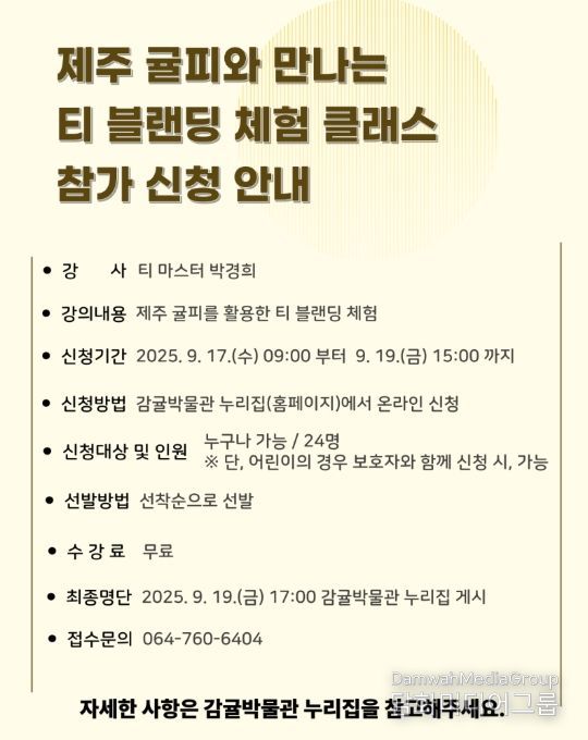 참가 신청은 9월 17일부터 19일 오후 3시까지 감귤박물관 누리집을 통해 선착순 접수하며, 모집 인원은 최대 24명이다. 제주 문화와 치유에 관심 있는 누구나 참여할 수 있으며, 어린이의 경우 보호자 동반 시 신청 참여가 가능하다.