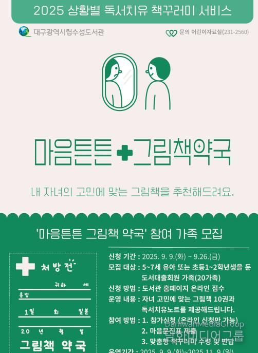 시민행정신문 기자 | 대구광역시립수성도서관은 어린이들의 마음 챙김을 위한 ‘마음 튼튼, 그림책약국’ 에 참여할 가족을 모집한다.