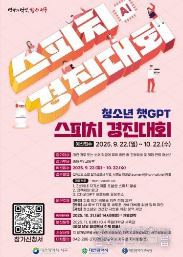 시민행정신문 강갑수 기자 | 대전 서구는 청소년 창의 사고력과 디지털 역량 강화를 위해 11월 8일 열리는 ‘청소년 챗GPT 스피치 경진대회’ 예선 참가자를 모집한다고 12일 밝혔다.