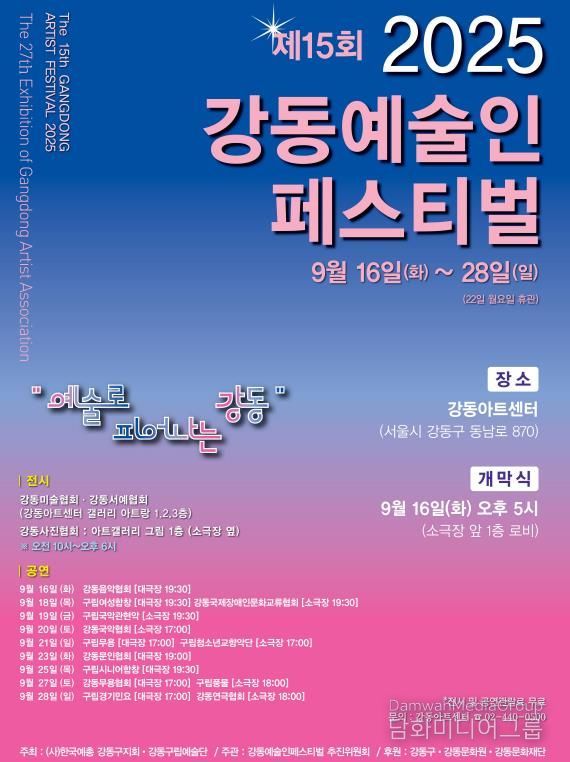이수희 강동구청장은 “올해로 15회를 맞은 강동예술인 페스티벌은 강동이 가진 문화적 저력을 보여주는 대표적인 행사”라며 “앞으로도 지역 예술인의 창작 활동을 꾸준히 지원하고, 강동예술인 페스티벌을 주민과 함께하는 열린 축제로 더욱 발전시켜 나가겠다”고 말했다.