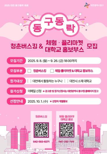 박희조 동구청장은 “2025 대전 동구동락 축제는 지역과 함께 성장하며 동구의 도시브랜드 가치를 높이는 축제가 될 것”이라며 “이번 모집에 많은 관심과 참여를 부탁드린다”고 말했다.