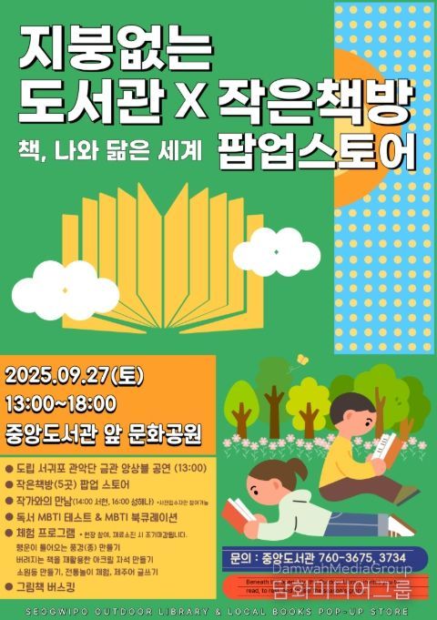 시민행정신문 기자 | 서귀포시도서관운영사무소는 오는 9월 27일 오후 1시부터 6시까지 중앙도서관 및 문화공원에서 지역 책방이 참여하는 '로컬북스 팝업스토어'와 야외 독서문화 행사 '지붕없는 도서관'을 함께 개최한다.