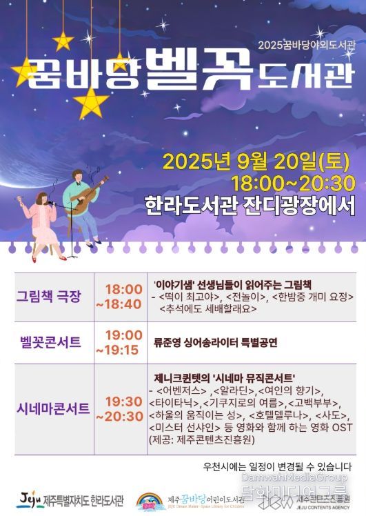 시민행정신문 기자 | 제주특별자치도 한라도서관(관장 양애옥)과 제주꿈바당어린이도서관은 20일 오후 6시부터 8시 30분까지 한라도서관 야외잔디마당에서 ‘꿈바당 벨꼿도서관 시네마 콘서트’를 운영한다.
