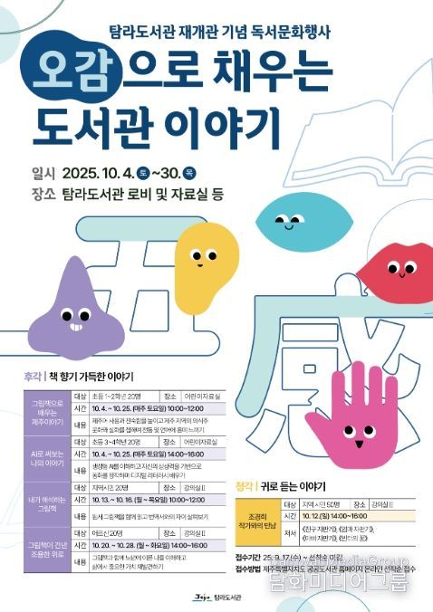 시민행정신문 기자 | 제주시 탐라도서관은 오는 9월 24일 재개관을 맞아 시민들을 위한 ‘오감으로 채우는 도서관 이야기’ 프로그램을 운영한다.