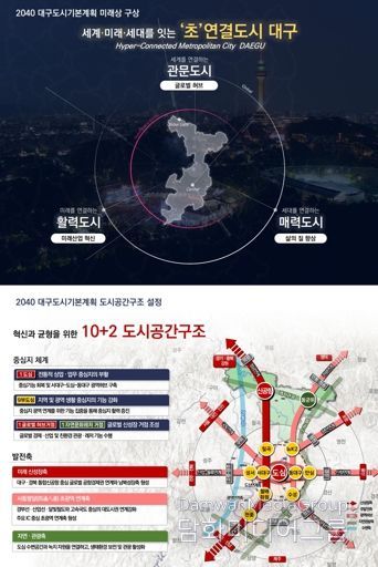 2040년 대구의 미래상은 ‘세계·미래·세대를 잇는 초연결도시 대구’로 제시하고, 미래상을 실현하기 위해 3대 목표를 △세계를 연결하는 관문도시 △미래를 연결하는 활력도시 △세대를 연결하는 매력도시로 설정했다.