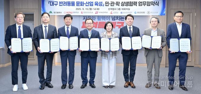시민행정신문 강갑수 기자 | 대구광역시는 반려동물 문화·산업을 미래 성장 동력으로 육성하기 위해 9월 15일 오후 2시, 산격청사에서 지역 6개 대학교 및 대구시수의사회와 함께 ‘대구 반려동물 문화산업 육성 민·관·학 상생협력 업무협약’을 체결했다.